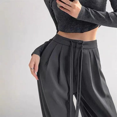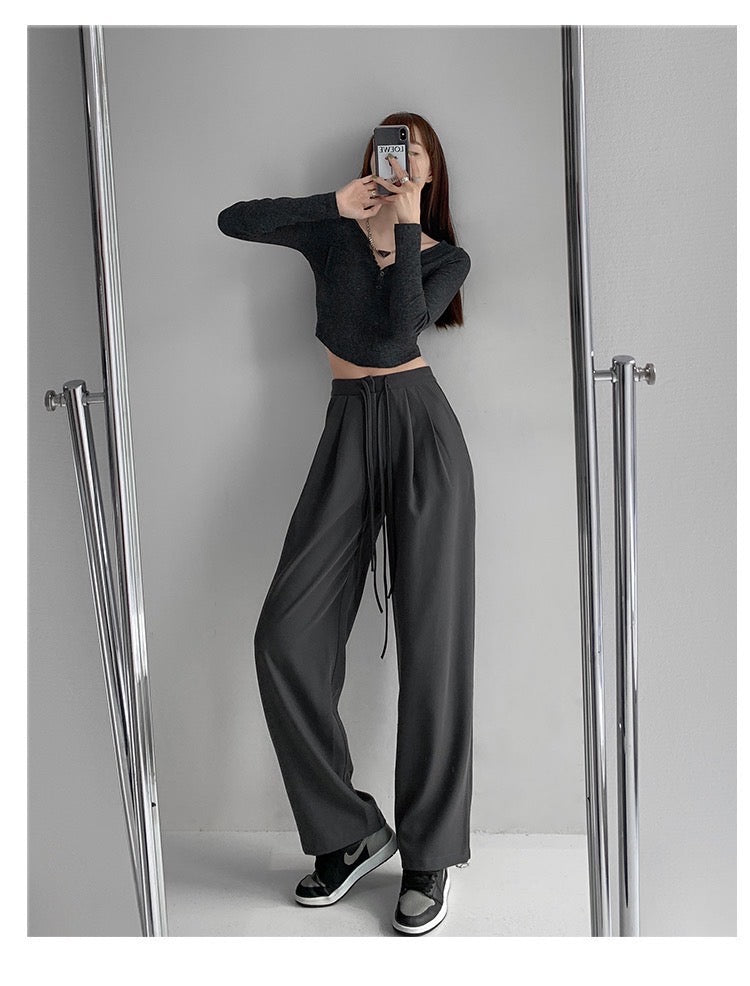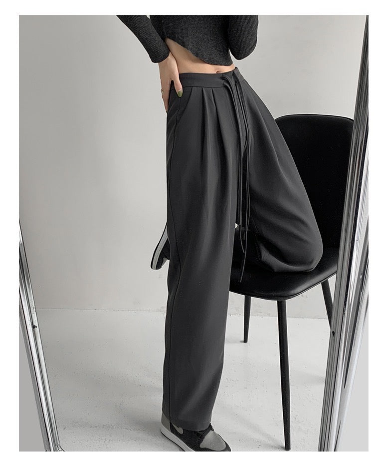 These Korean-style wide leg joggers offer both style and comfort. Made from lightweight fabric, these trousers feature pleats and a drawstring waist for a modern, yet relaxed fit. The loose cut and adjustable waist make these joggers a versatile addition to any wardrobe.